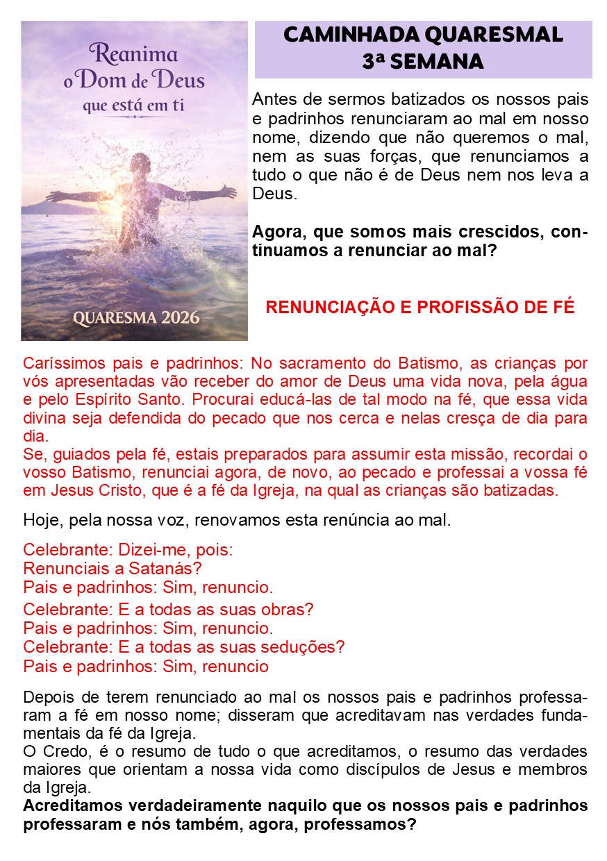 Partindo das propostas que nos são feitas pelas Orientações Diocesanas de Pastoral, que, neste ano, centram a nossa atenção no Sacramento do Batismo, viveremos a nossa Quaresma sob o lema "Reanima o Dom de Deus que está em ti", onde procuraremos, em Comunidade, reanimar e reavivar a graça do nosso Batismo.