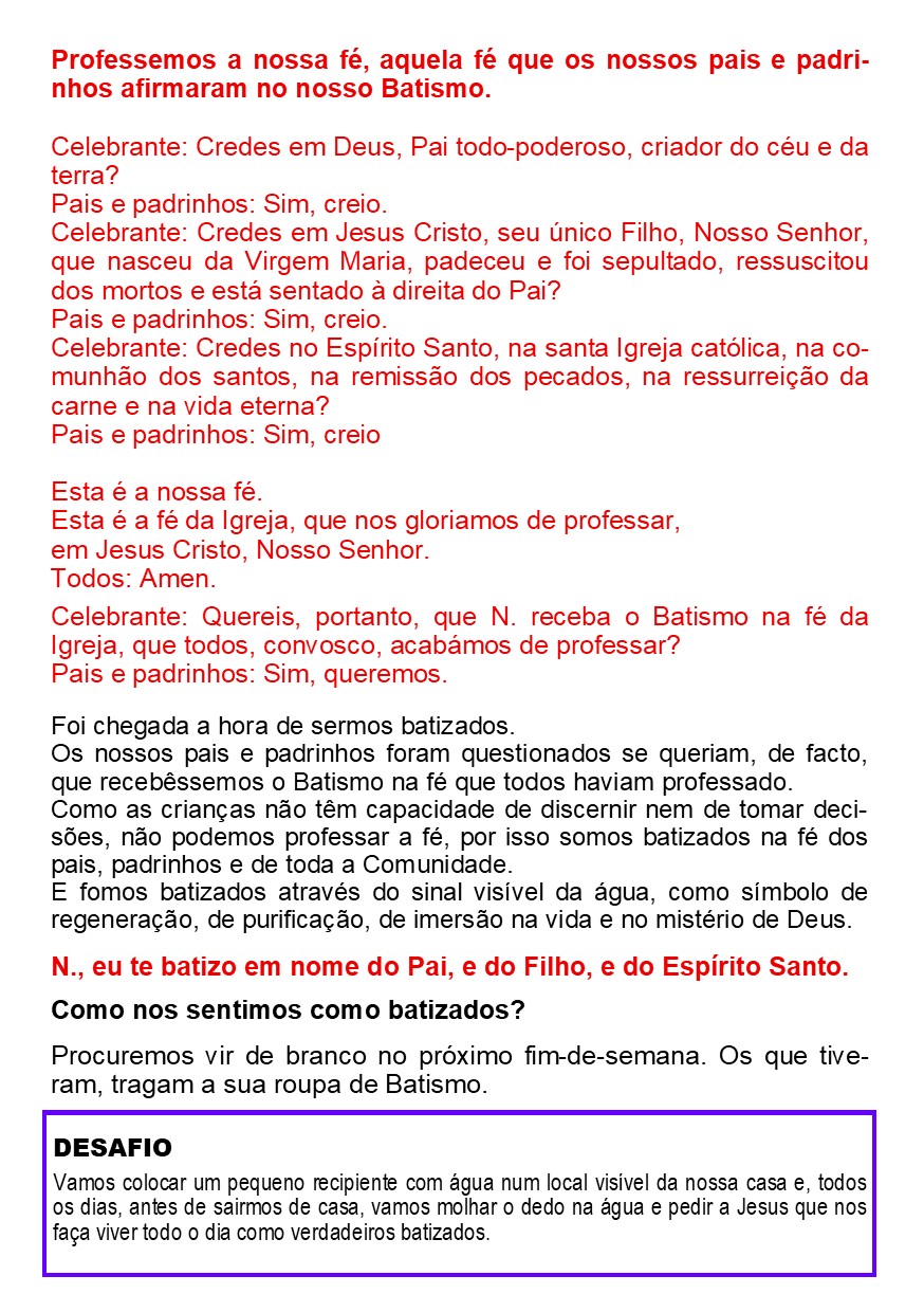 Em cada semana é-nos proposto a reflexão, aprofundamento e celebração de uma parte do Ritual do Batismo, permitindo desta forma uma plena atualização da Graça que no Batismo recebemos.